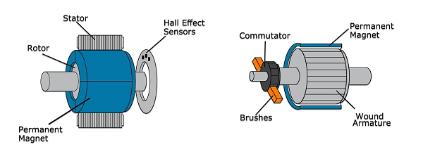 为了解释这些图表,以及有刷电机与无刷直流电机的运行差异,基本上将无刷直流电机翻转过来;无刷直流电机在转子上有永磁体,在定子上有电磁铁。这种设计消除了对电刷的需要,因为它消除了电刷翻转电磁场的需要(这是在有刷电机中所做的)。在无刷直流电机中,数字控制器被用来为定子中的电磁铁充电,使转子旋转360度。
