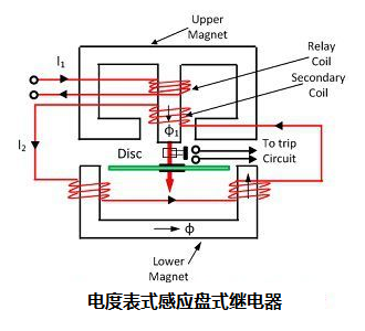 初级绕组承载继电器电流I 1而次级电流在次级感应电动势,因此电流I 2在其中循环。磁通量φ1在E脱落磁体中感应,磁通量φ在U形磁体中感应。这些在上磁体和下磁体中感应的磁通相位相差角度θ,这将在盘上产生与φ1φsinθ成比例的驱动转矩。